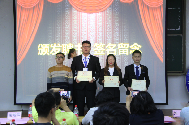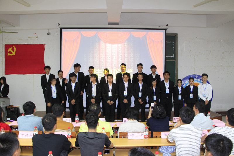 伴随着庄严的国歌声,大会拉开了序幕。大会首先播放了换届视频,视频讲述了17级学生会成员和老师对16级学生会学长学姐们的祝福与期望,讲述了16级学长学姐们对团总支、学生会的不舍与期盼。在热烈的掌声中,梁喻深老师、章丰慧老师、刘恒老师、梁宇老师、李梅清老师分别为16级委员颁发聘书,学生会主席魏博的发言,他总结了团总支学生会过去一年里所做的额努力,表达了自己对学生会的感恩之情、不舍之情,以及对下一届学生会干事的期望。随后梁喻深老师宣读团总支、学生会新一届委员名单,16级干部为17级干部挂牌,将学生会工作火炬郑重地交到新一届委员手上。新任学生会主席姚铭浩发言,他表示会用实际行动把电气系学生会做的更好。