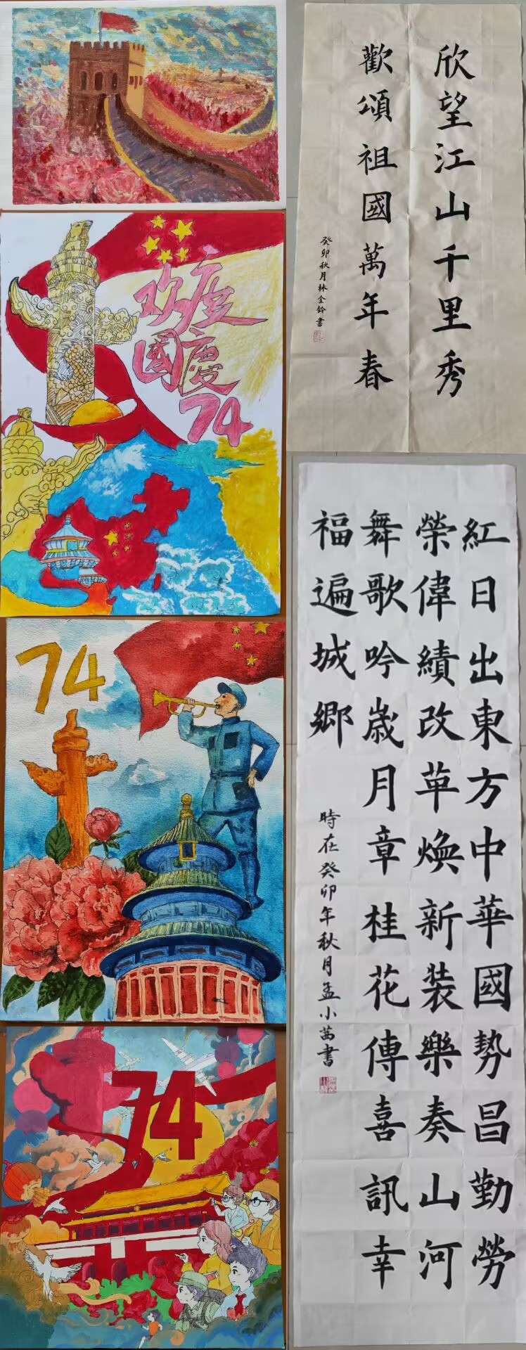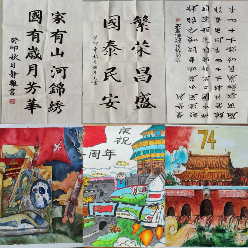 为庆祝新中国成立74周年,大力弘扬学子爱国主义精神,我系团总支宣传部主办的"欢庆新中国成立74周年"艺术作品展在4栋教学楼正式开幕。