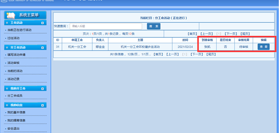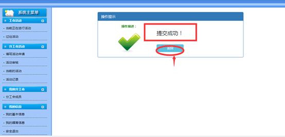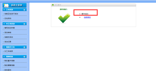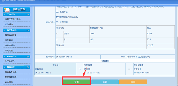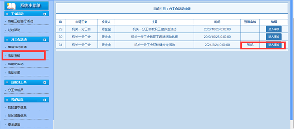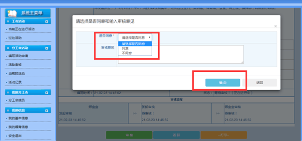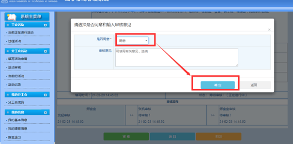 3.分工会主席登录工会信息管理系统,点击“活动审核”、“进入审核”,“同意”,“确定”提交分校工会审批