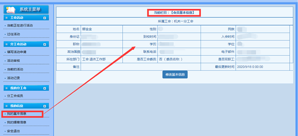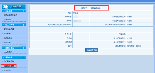 会员登录工会信息管理系统可查看本人基本信息及婚育信息,如导入信息有误或不完善,请在2021年3月3日至4月30日期间进行修改、完善更新信息并保存。