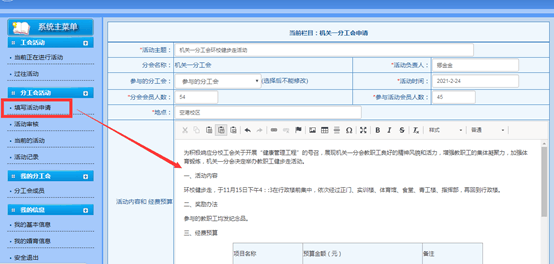 1.登录工会信息管理系统。由各分工会文体委员发起填写“活动申请”,并提交审核。
