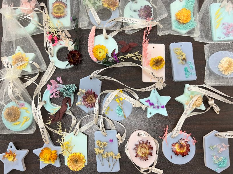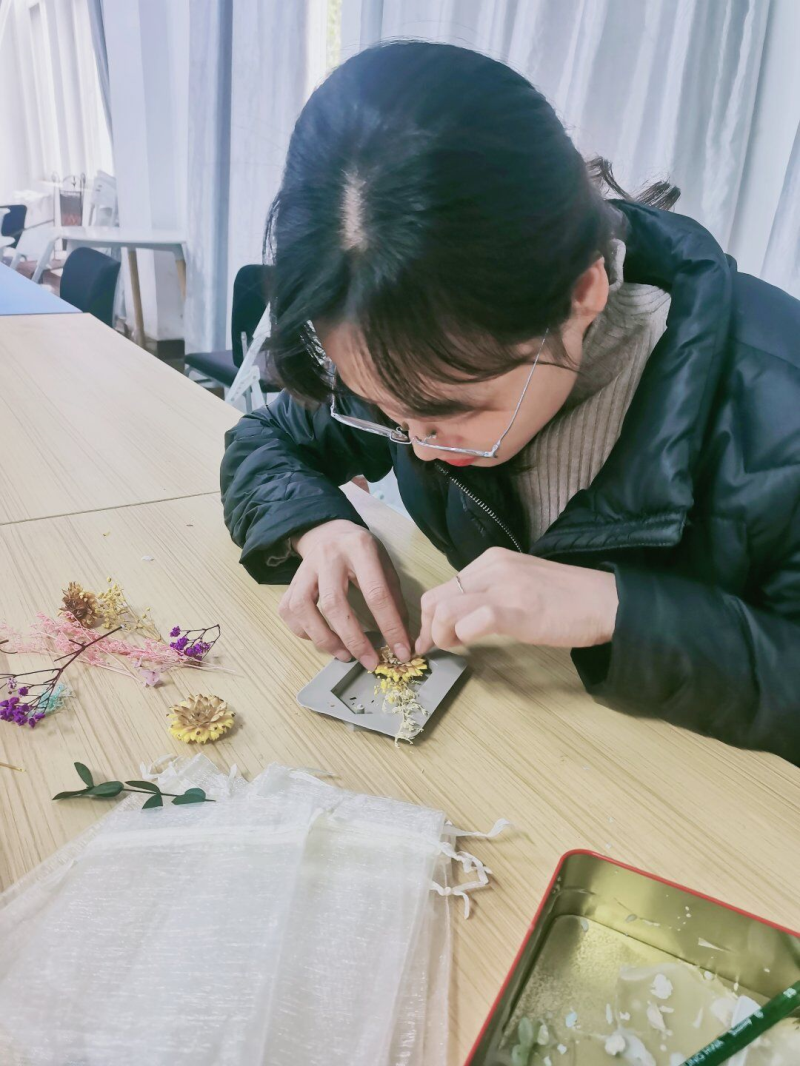 活动现场,芳香四溢。戎玥老师首先介绍了香薰的由来、类型及使用方式,详细讲解了香薰蜡片的制作过程,大家跟着戎老师的讲解,融化蜡块、倒入蜡液、添加精油、挑选干花、摆放装饰,等到蜡液凝固,充满浪漫气息的香熏蜡片便制作完成啦。