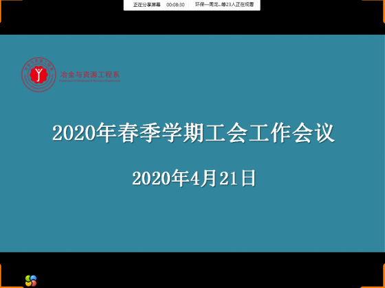 4月21日下午,冶金与资源工程系分工会通过网络方式组织全体教职工召开2020年春季学期工会工作会议。