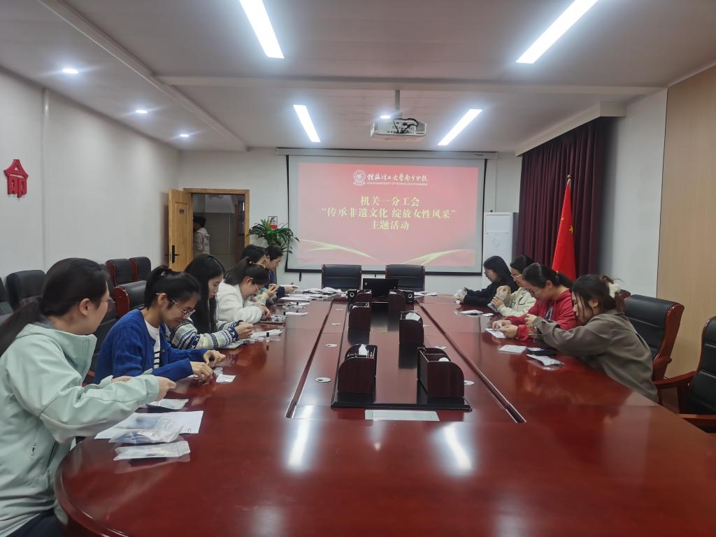 为弘扬中华优秀传统文化、增强女性职工文化自信与法律意识,3月12日下午,机关一分工会在空港校区行政楼417会议室举办“传承非遗文化,绽放女性风采”妇女节庆祝活动。