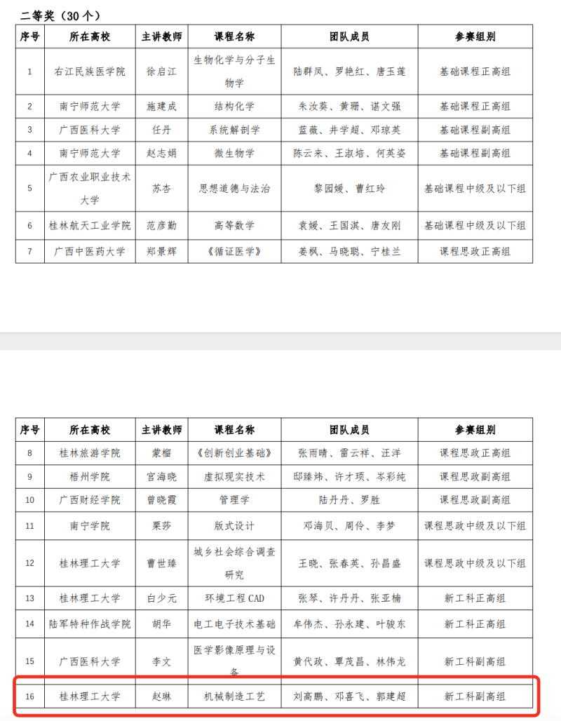 据悉,全国高校教师教学创新大赛是一项高水平综合性教学比赛,在助力“四新”建设、推进课程思政建设上起着示范引领作用,是高校教师教学创新与交流的标杆和唯一一项纳入教育部“三评一竞赛”的教师教学竞赛,在高校教师中有极大号召力和影响力。本届大赛广西赛区比赛共有39所高校、218个教师(团队)参赛,通过网络评审进入现场赛环节的教师(团队)119个,最终评出一等奖15个、二等奖30个、三等奖74个。