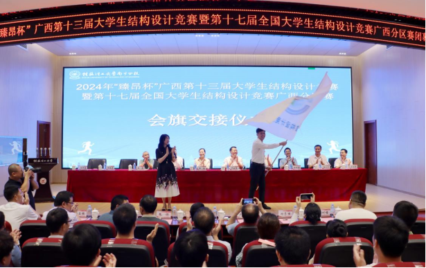 许胜才在会旗交接仪式上代表下一届承办单位贺州学院接过会旗,并发出2025年广西大学生结构设计竞赛相聚贺州学院的邀请。许胜才代表贺州学院郑重承诺:将举全力办好2025年广西第十四届大学生结构设计竞赛,并为参赛队伍提供最优质的比赛条件和服务。
