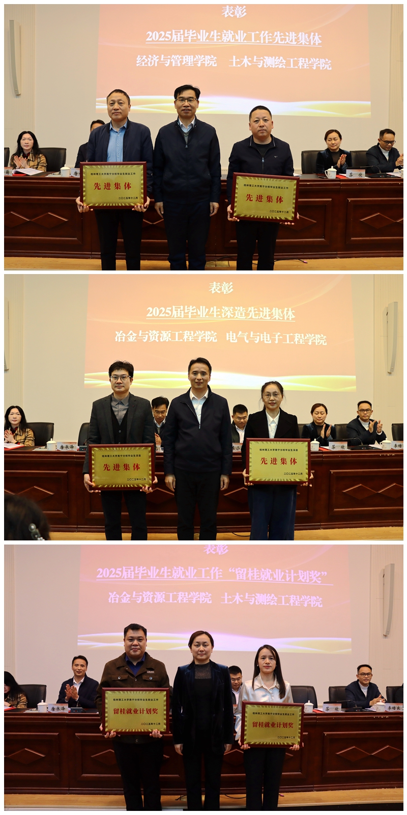 会上,经济与管理学院党委书记吕广文、冶金与资源工程学院党委书记韦国才分别作为2025届毕业生就业工作先进集体和毕业生深造先进集体代表发言。土木与测绘工程学院辅导员臧云飞作为就业工作先进个人代表发言。