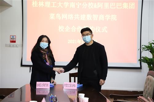 阿里巴巴菜鸟网络华南大区总经理张忠全、南宁分校副校长马华菊分别代表校企双方签署校企合作共建“阿里菜鸟数智商学院”项目框架协议。