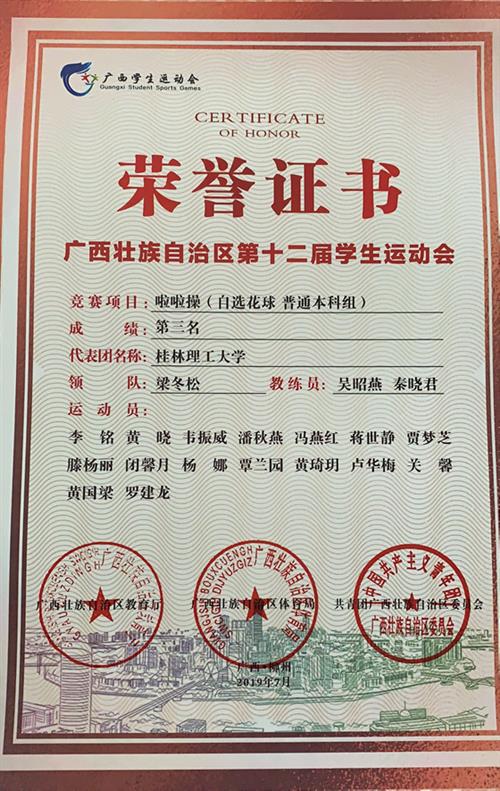 2019年广西第十二届学生运动会运动会啦啦操获奖证书