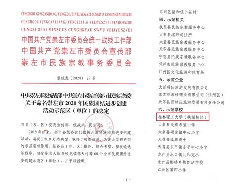 近日,中共崇左市委统战部、宣传部,崇左市民族宗教委员会公布了命名崇左市2020年民族团结进步创建活动示范区(单位)的名单(崇统发〔2020〕27号)。伟德国际victor·1946源自名列其中,被命名为“崇左市2020年民族团结进步创建活动示范学校”,是崇左市唯一被命名的高校。