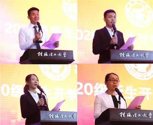 在校生代表、土木与测绘工程系工程管理2017-3班马洪超同学与同学们分享了自己在校的学习感悟,希望学弟学妹们志存高远、勇敢追梦,德才并重、担当作为,勇于开拓、不负韶华;2020级专科新生代表、电气与电子工程系电子信息工程技术2020-2班宋明奇回顾了疫情下特殊的高考经历,表示对家国情怀有了更加深刻的体会,将在桂工不断汲取知识、锤炼品格,把自己塑造成为适应现代社会需要的、能堪当大任的新时代大学生;2020级本科新生代表、经济与管理系会展经济与管理2020-2班李梦渝表达了对大学生活的憧憬,号召全体2020级新同学们自主学习、自律自爱,发掘潜力、博学笃志,广泛社交、丰富自我,牢记使命,继承和发扬桂工精神,为青春和梦想交一份满意答卷。