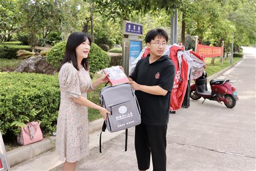 马华菊副校长为志愿者代表送上祝福及承载着母校寄托的书籍《习近平的七年知青岁月》和爱心礼包