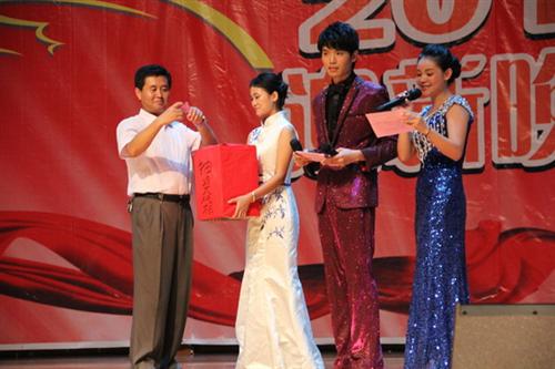 肖岳峰副校长在晚会互动环节为获奖学生颁奖并合影