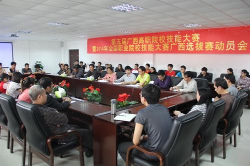 4月9日下午,我院在空港校区行政办公楼204会议室召开第五届广西高职院校技能大赛暨2014年全国职业院校技能大赛参赛动员大会。院长王文、副院长陈东莲出席会议并讲话,各参赛系部主任、指导教师以及参赛选手参加会议。会议由教务科研部主任刘平主持。