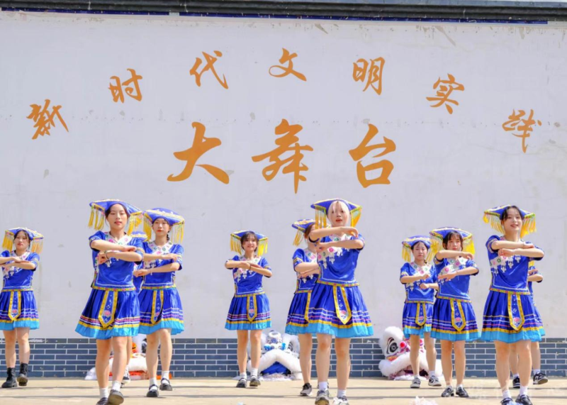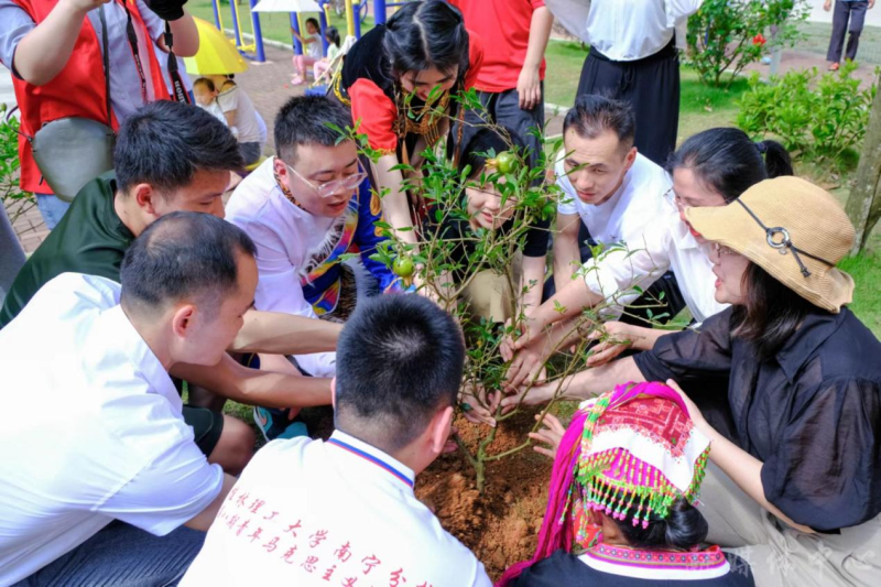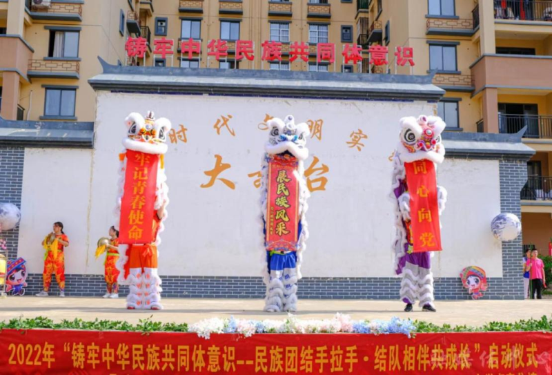 活动在民族传统技艺舞狮子中拉开帷幕。精彩的民族舞蹈节目串烧表演,赢得在场人员阵阵欢呼;民族趣味互动小游戏,大家一对一进行交换卡片和小礼物,拉近彼此的距离;在同印一幅中国地图画中,来自新疆、内蒙的大学生代表等与结队少先队员纷纷按上自己的手印,讲述爱家乡的故事;来自维吾尔族、蒙古族、瑶族、壮族、仫佬族等高校老师、大学生、团县委同志与安置点苗族、壮族等小朋友一起种下石榴树,同心共筑中国梦;活动在同唱《爱我中华》中达到高潮。