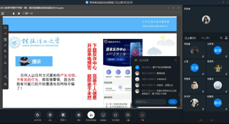 经济与管理系组织辅导员开展线上“大学生成长成才”专题思政课。课程就校园疫情防控、春季传染病预防、谨防诈骗三大方面做详细解读,强调要树立健康第一责任人意识,严格遵守各项疫情防控要求;要增强自身体质和免疫力,在日常生活中养成良好的饮食习惯,牢记预防疾病15字口诀;要保持高度警惕性,牢记反诈骗“十个凡是”,提高电信诈骗防范意识,及时辨别诈骗手段,谨防上当受骗。