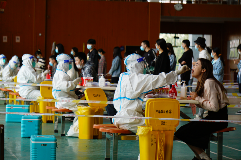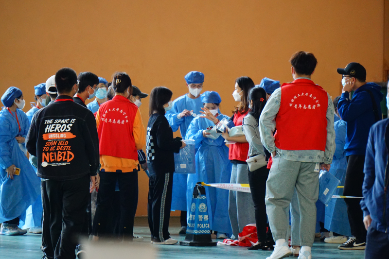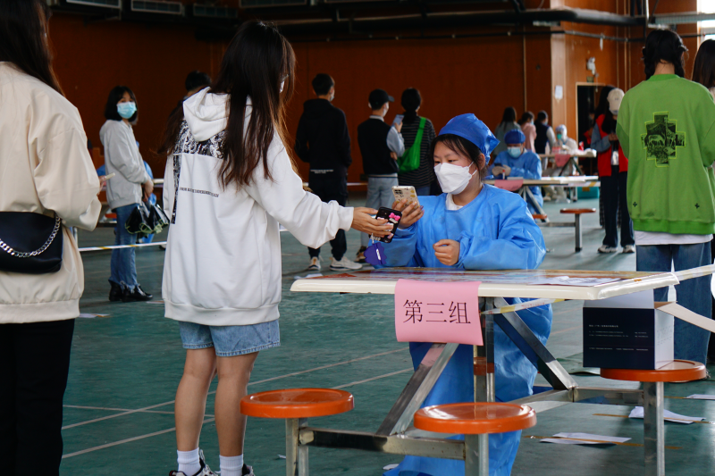 上午9时,在各系辅导员指挥带队,志愿者登记和维持秩序,医护人员采集咽拭子,所有工作人员密切配合下,第一批受检学生在志愿者们的指引下,按照10人一组依次进行核酸检测,现场过程井然有序。