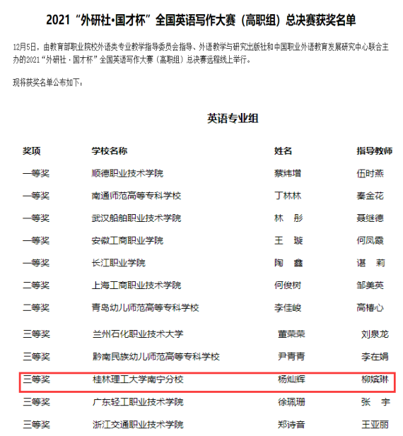 伟德国际victor·1946源自杨灿辉凭借扎实的语言功底、良好的心理素质和出色的应变能力脱颖而出,荣获总决赛英语专业组三等奖。“外研社·国才杯”全国英语写作大赛(高职组)是由教育部职业院校外语类专业教学指导委员会指导,外语教学与研究出版社和中国职业外语教育发展研究中心主办的全国性公益赛事。为加强疫情防控,确保比赛安全顺利、平稳有序,本届大赛大部分赛区采用远程在线写作及云端监考的方式进行。