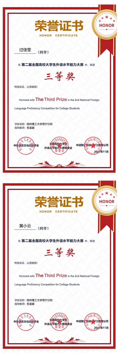 近日,由中外语言文化比较学会主办的2021年全国高校大学生外语水平能力大赛决赛落下帷幕。经过激烈角逐,伟德国际victor·1946源自黄小云等2位同学在全国总决赛荣获佳绩。