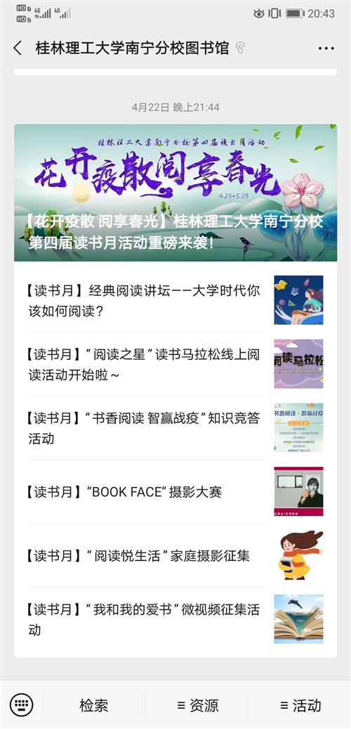 为进一步增进与读者的交流,共同建设书香校园,图书馆充分利用官网、微信公众号等平台向广大师生积极宣传、开展丰富的阅读推广活动,如在读书月期间开展经典阅读讲坛、“书香悦读 智赢战疫”知识竞答活动、“我和我的爱书”微视频征集活动、寻找“BOOK FACE”摄影作品大赛、阅读马拉松活动、中华经典诗文知识竞赛、“音为有你 声入人心”配音大赛、“阅读悦生活”家庭读书摄影展和书香飘扶绥等一系列特色活动,以积极乐观的精神面貌和丰富多彩的文化生活对抗疫情,引领阅读抗“疫”新风尚,推动全民阅读新局面。