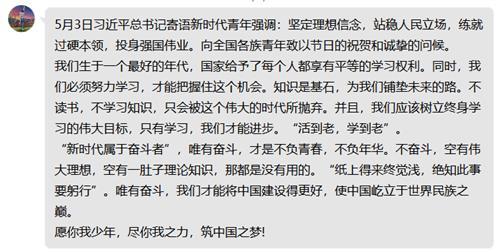 在2020年五四青年节到来之际,中共中央总书记、国家主席、中央军委主席习近平代表党中央,向全国各族青年致以节日的祝贺和诚挚的问候!