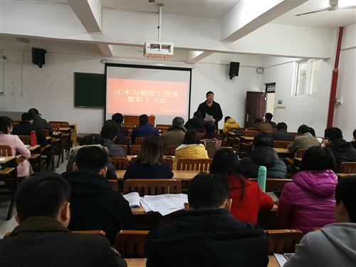 1月17日上午,土木与测绘工程系在物华楼402教室召开全系教职工会议,总结该系2018年度党建工作、团建工作、学生工作和教学科研工作等各项工作情况,并对2019年系部工作提出具体要求。该系全体教职工参加会议,会议由该系党总支书记黄文学主持。