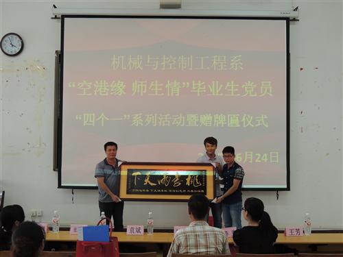 为做好2015届毕业生离校工作,保证毕业生安全文明离校,机械与控制工程系开展充分发挥毕业生党员的先锋模范带头作用,于6月23日-26日期间开展以“空港缘·师生情”为主题的毕业生党员“四个一”系列活动,该系党总支书记袁斌、副主任刘高鹏、副书记刘术刚、毕业班班主任以及全体毕业生党员参加了本次系列活动。