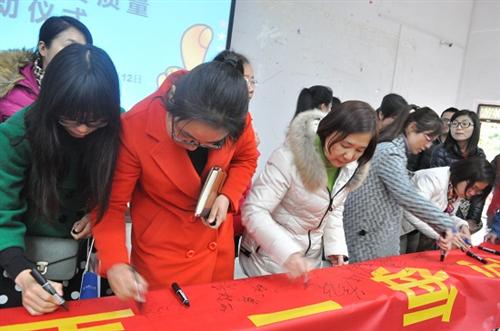 与会全体师生在“向每一堂课要质量”横幅上签名