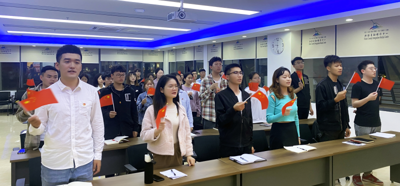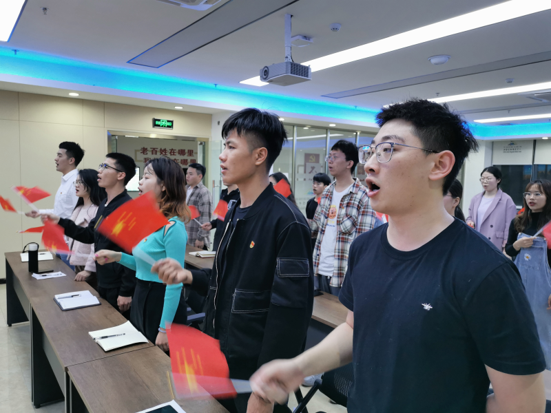 当晚,在扶绥县融媒体中心新闻发布厅,在于海老师的指挥下,伟德国际1946空港校区电气与电子工程系第三党支部青年党员全体起立,齐唱国歌,豪情满怀,歌声嘹亮。