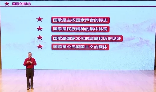 于海老师从“国歌的概念”、“国歌的发展历程”、“国歌是国家神圣的象征”、“我们的国歌是世界上最好的国歌”、“国歌是不忘初心教育的生动教材”等部分,为同学们深入透彻地讲解了不同类型国歌的特点,通过引导同学们回顾中国近代历史进程来产生爱国主义的强大情感共鸣,从而理解这首在战火纷飞的年代创作的歌曲所承载的情怀和其跨时代意义。