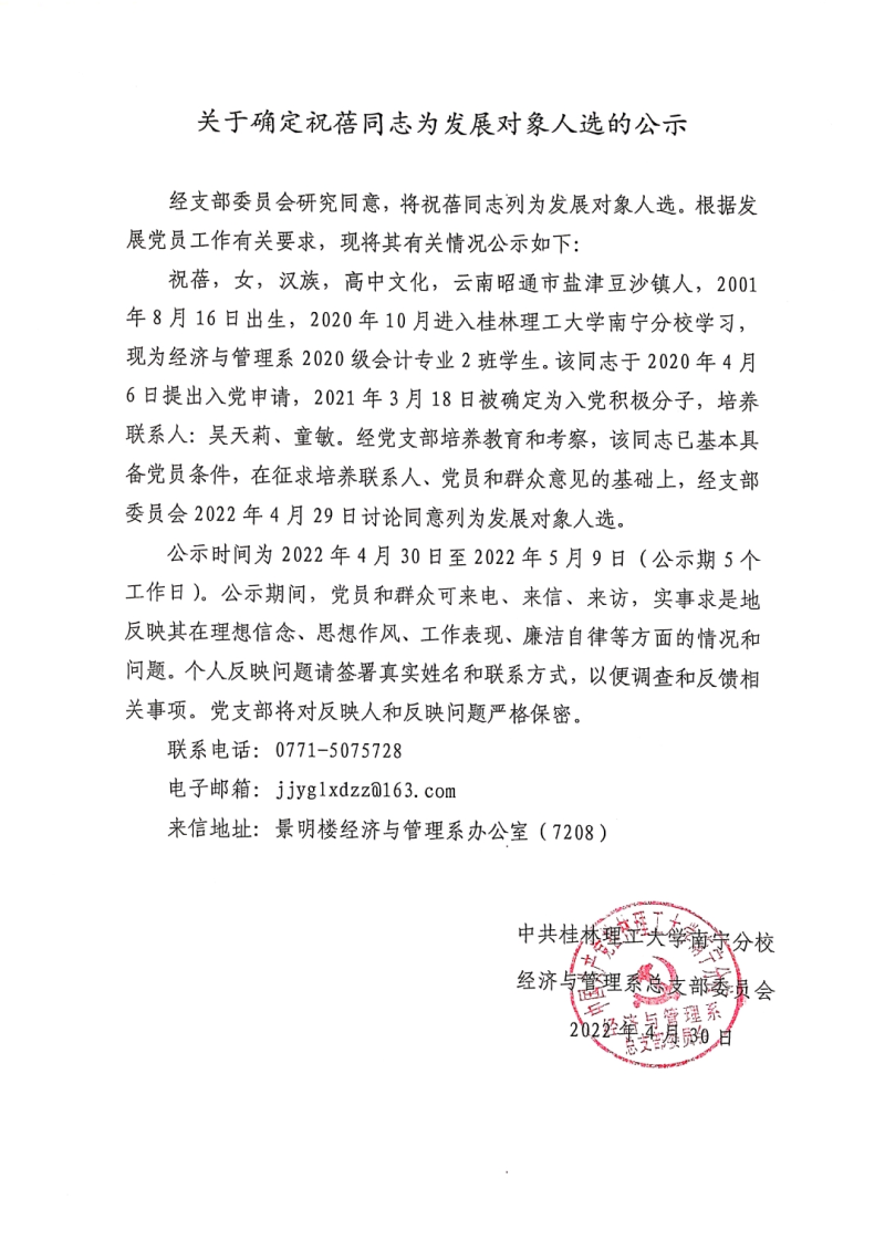 关于确定祝蓓同志为发展对象人选的公示