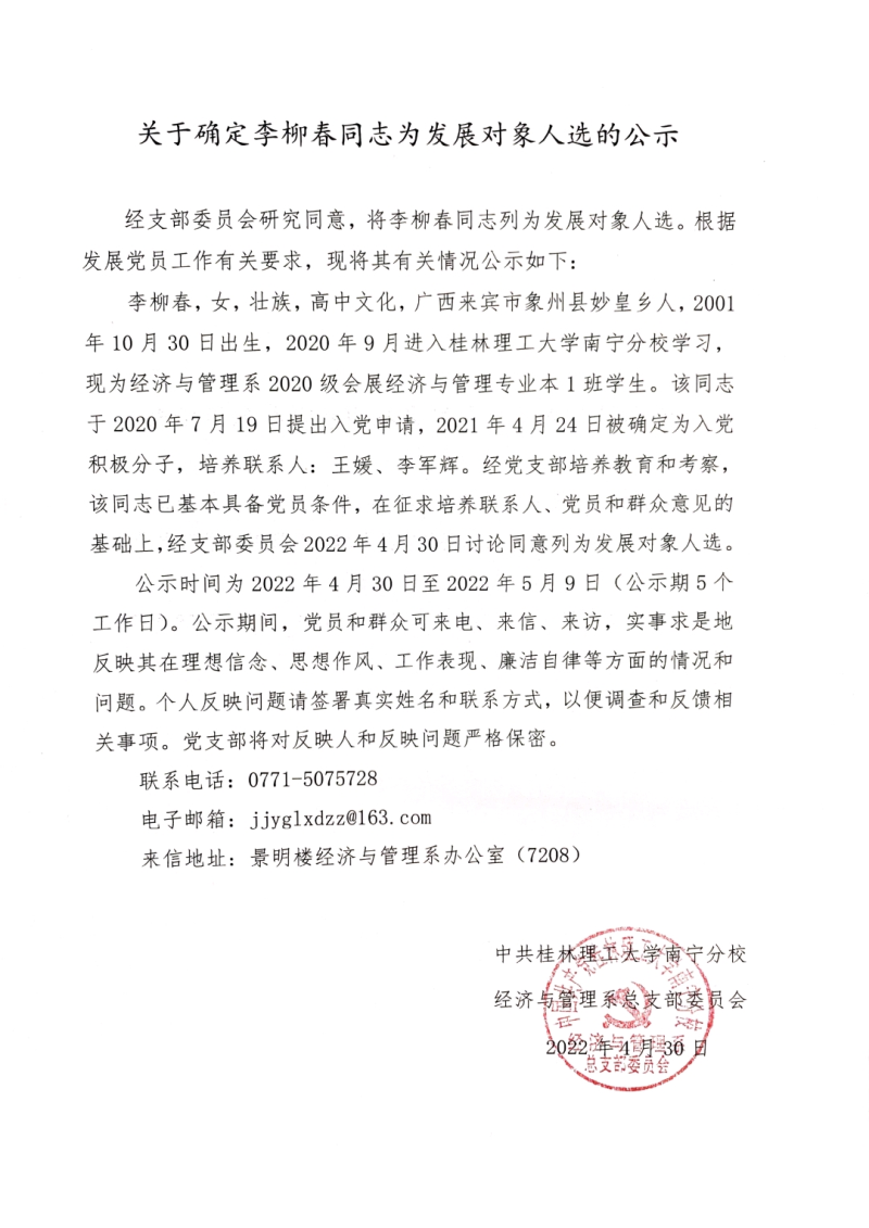 关于确定李柳春同志为发展对象人选的公示