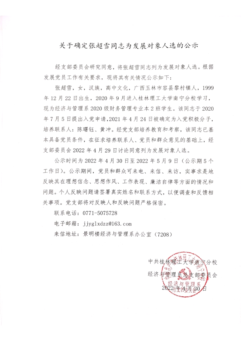 关于确定张超雪同志为发展对象人选的公示