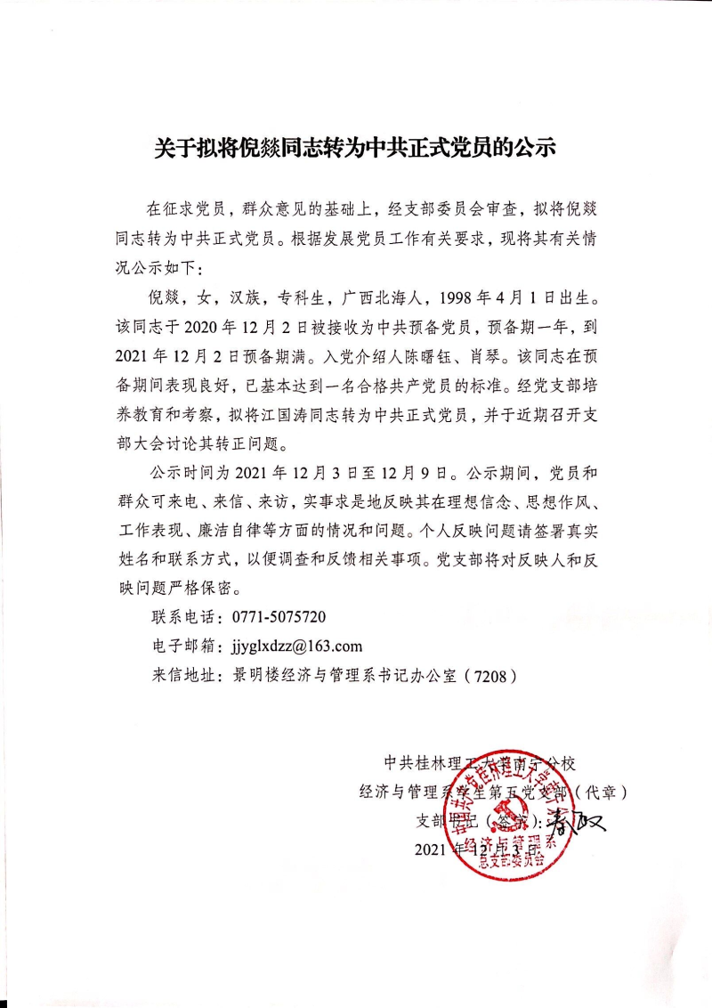 关于拟将倪燚同志转为中共正式党员的公示