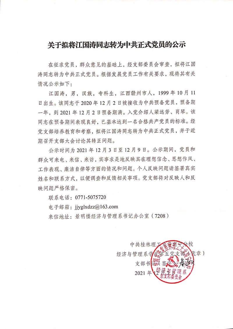 关于拟将江国涛同志转为中共正式党员的公示