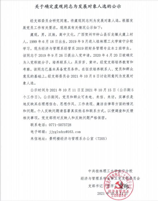 关于确定虞观同志为发展对象人选的公示