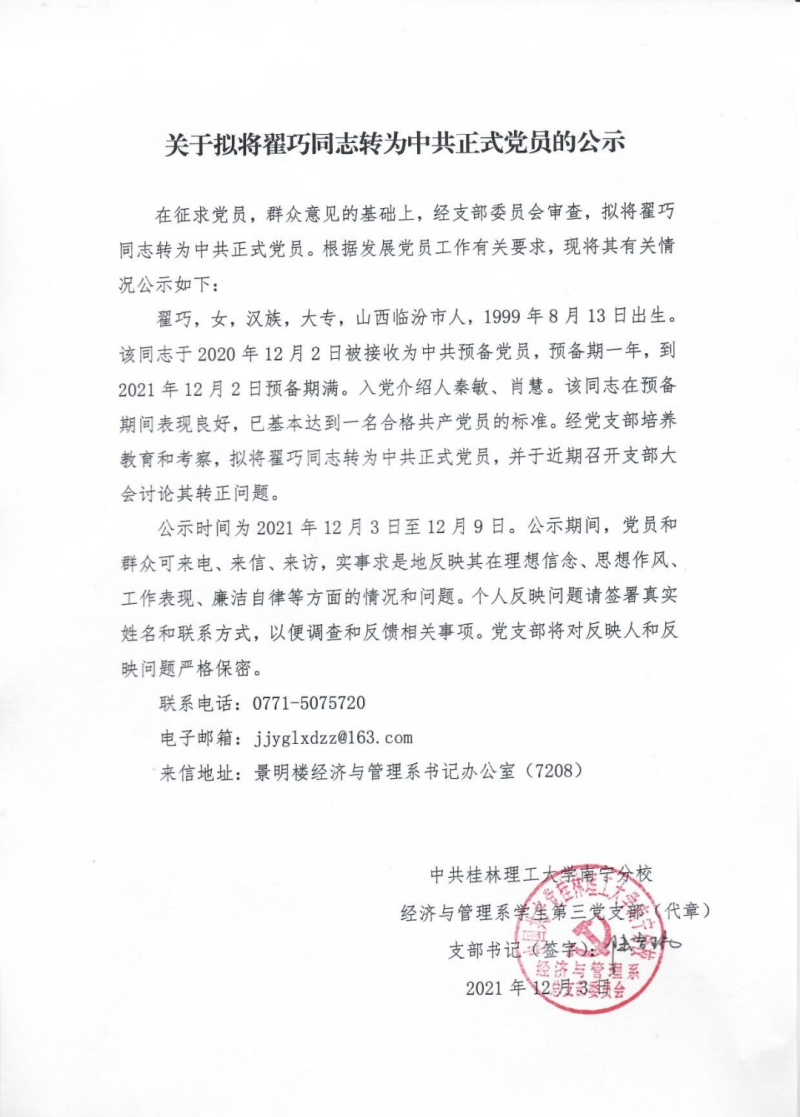 关于拟将翟巧同志转为中共正式党员的公示