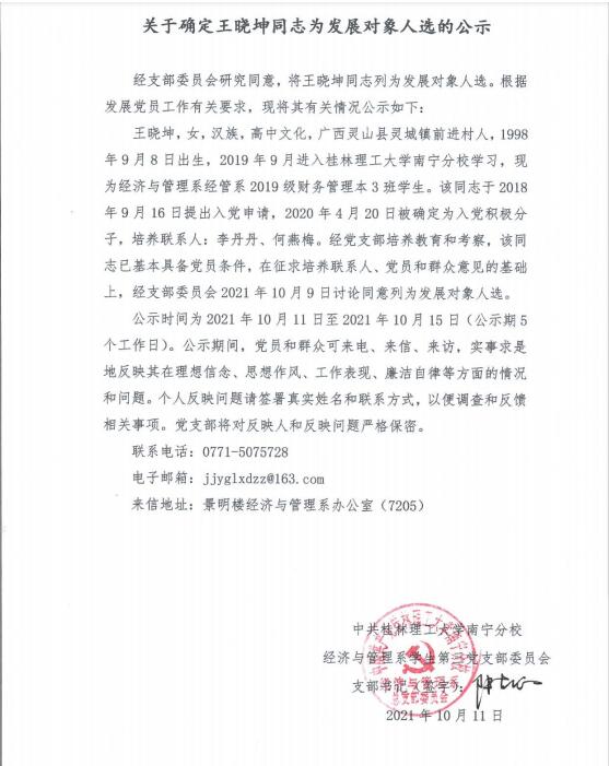 关于确定王晓坤同志为发展对象人选的公示
