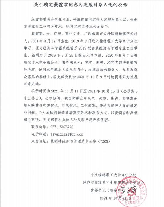 关于确定戴霞霏同志为发展对象人选的公示