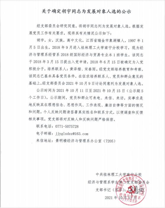 关于确定胡宇同志为发展对象人选的公示