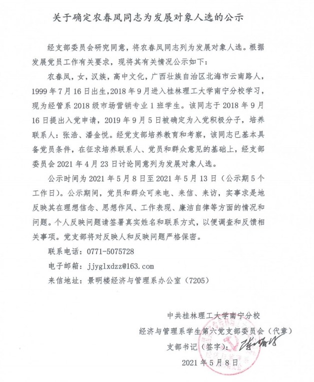 经济与管理系学生第六党支部关于确定农春凤同志为发展对象入选的公示