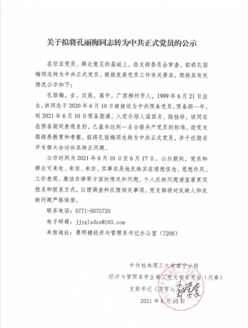 关于拟将孔丽梅同志转为中共正式党员的公示