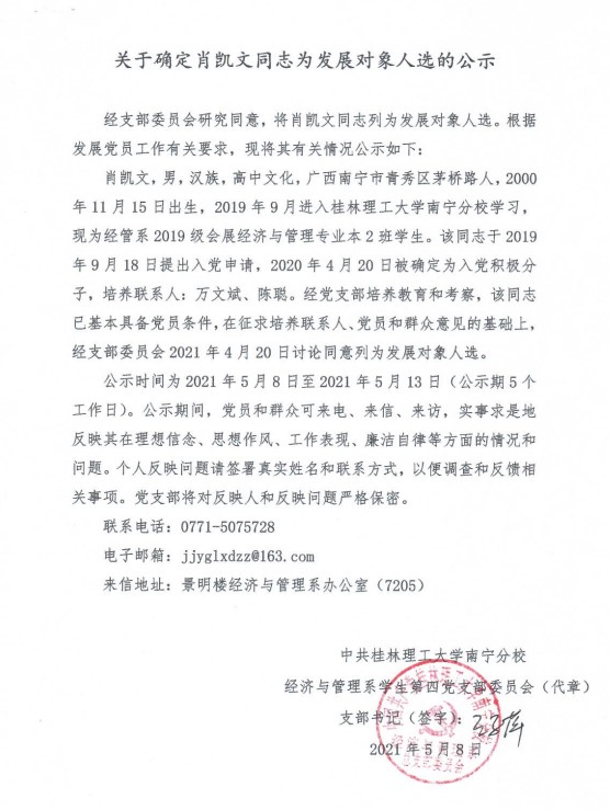 经济与管理系学生第四党支部关于确定肖凯文同志为发展对象入选的公示