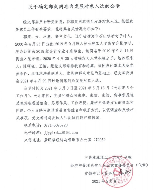 经济与管理系学生第五党支部关于确定郭爽同志为发展对象入选的公示