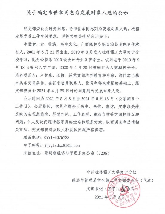 经济与管理系学生第五党支部关于确定韦世拿同志为发展对象入选的公示