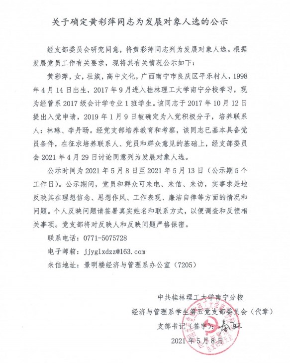 经济与管理系学生第五党支部关于确定黄彩萍同志为发展对象入选的公示