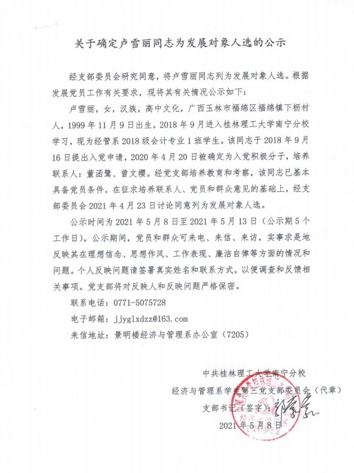 经济与管理系学生第三党支部关于确定卢雪丽同志为发展对象入选的公示