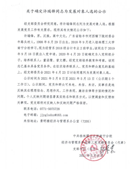 经济与管理系学生第三党支部关于确定许瑞锋同志为发展对象入选的公示