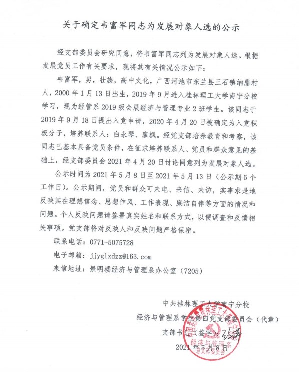 经济与管理系学生第四党支部关于确定韦富军同志为发展对象入选的公示