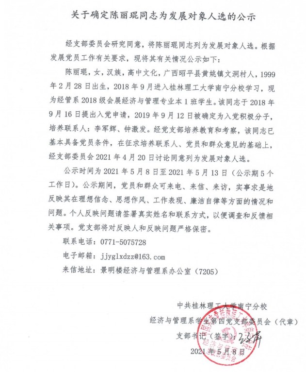 经济与管理系学生第四党支部关于确定陈丽琨同志为发展对象入选的公示
